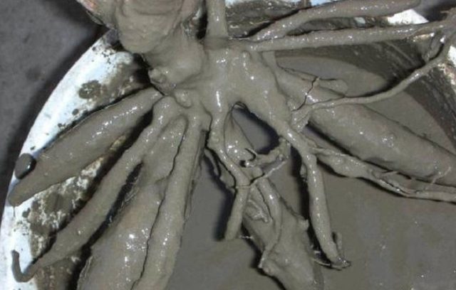 Készítsen elő egy agyagpépet a gyökerekhez, hogy megakadályozza a kiszáradásukat szállítás vagy átültetés során. A fecsegő vízből, földből és agyagból készül, fűrészpor hozzáadásával, amelyek tapadnak a gyökerekhez és megtartják a nedvességet. Feldolgozás után a gyökereket műanyag csomagolásba vagy zsákvászonba kell csomagolni.