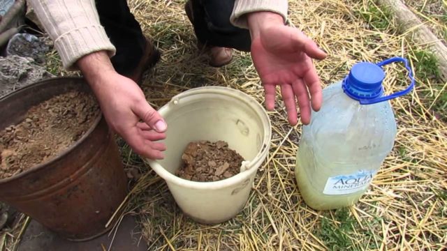 - Az oltott meszet (legfeljebb 2,5 kg), az olajos agyagot (1 kg) és a réz-szulfátot (45-55 g) egy vödör vízbe öntjük.