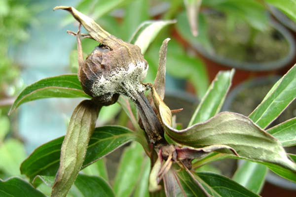 Egy másik veszélyes betegség a szürke rothadás, amely az egész növény egészét érinti. A betegséget a szár alján lévő barna foltok, a hervadó hajtások és a levéllemezeken megjelenő szürkés virágzás alapján ismerheti fel.A bazsarózsa a gomba hatására gyorsan elpusztul, magas páratartalom mellett különösen gyorsan fejlődik a szürke rothadás.
