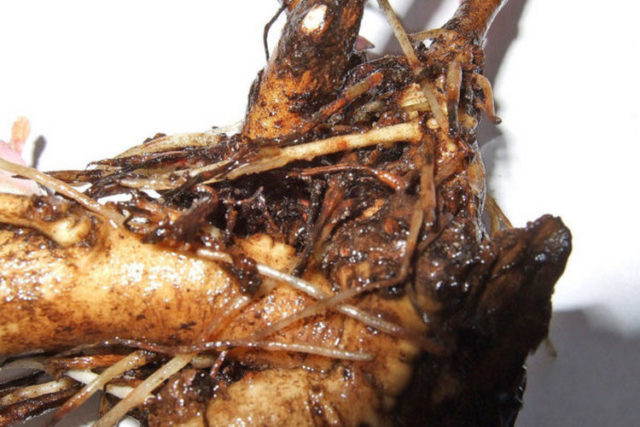 A bazsarózsa gumók betegségei közül a gyökérrothadás különösen veszélyes. Egyszerre több gomba hatására fejlődik ki, de minden esetben a gyökerek és a légi részek pusztulását váltja ki. A betegséget a levelek és a szárak fonnyadásával ismerheti fel, és ha a sérült bazsarózsa kiássa a földről, kiderül, hogy a gyökerek barnává váltak, fehéres vagy rózsaszínű virágzással borítottak és rothadni kezdtek.