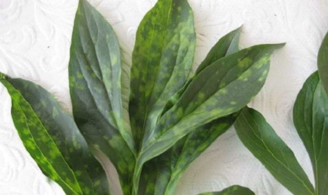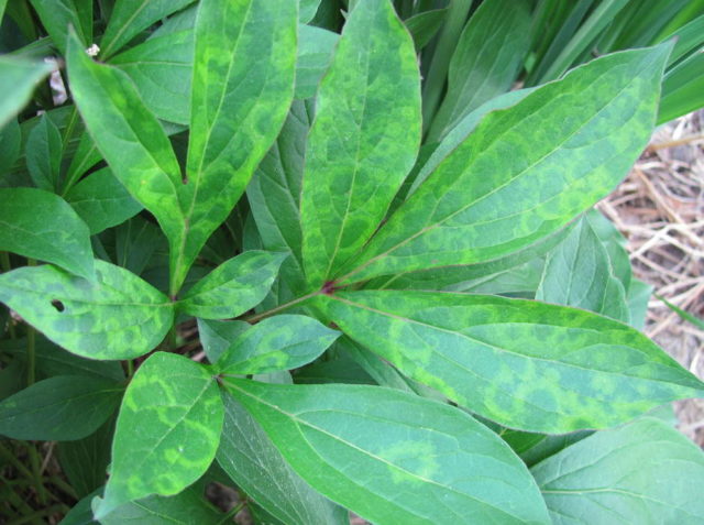A csörgő vírus a pünkösdi rózsa betegsége, amelyet a leveleken világoszöld vagy sárgás foltok jelennek meg. A fa bazsarózsa betegségének fényképén látható, hogy a foltok félgyűrűk vagy gyűrűk formájában vannak. Gyakran összeolvadnak egymással, és mintát képeznek a levéllemezeken. A vírus tünetei májusban vagy júniusban kezdődnek.