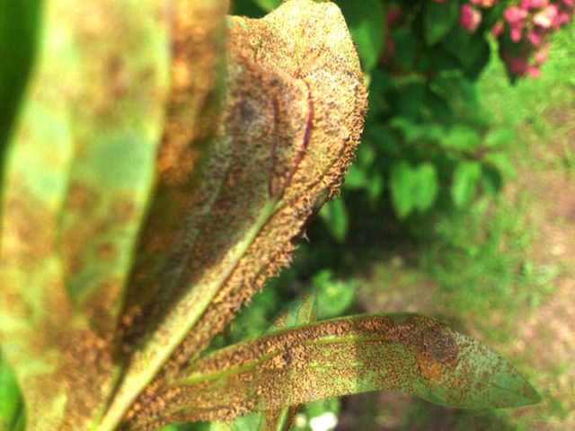 Fokozatosan a foltok nagyobbak lesznek, összeolvadnak egymással, és az egész lapot egészében lefedik. Magas páratartalom esetén a levél alsó részén sötétszürke gombavirágzás jelenik meg, előrehaladott esetekben nemcsak a levelek szenvednek, hanem rügyes szárak is.