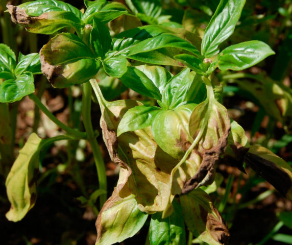 Ha a bazsalikom szabadon növekszik, mérsékelten öntözik, nem valószínű, hogy megbetegszik. A megvastagodott telepítések és a magas páratartalom gyakrabban jelent problémát az üvegházakban, mint a szabad terepen. De ha a kultúrát a bokor növekedésének figyelembevétele nélkül ültetjük, a gyakori öntözést igénylő növények mellett problémák merülhetnek fel. A bazsalikom túl esős nyáron is szenved, különösen sűrű talajon. Beteg lehet: