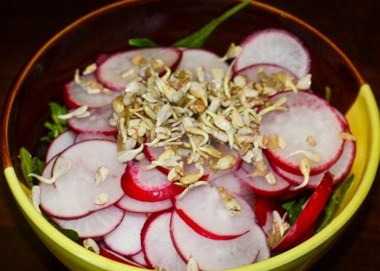 A napraforgó hajtásokat naponta 2-3 alkalommal fogyasztják (összesen legfeljebb 80-100 g, azaz legfeljebb 4-5 evőkanál. L.). Az egyik legegyszerűbb és legfinomabb lehetőség az, ha a hajtásokat salátába teszik. Az alkotóelemek bármi lehetnek, például "nyári" recept: