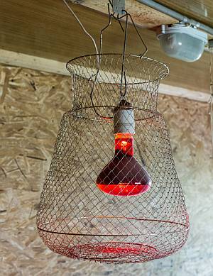 A vörös lámpa alját 100% -ban védeni kell a madarakkal való érintkezés és a fröccsenő víz ellen. Ehhez a patront felfüggesztéssel biztonságosan rögzítik a mennyezethez, és egy fém hálós kerítést hoznak létre a lámpa körül. A víz lombikba kerülésének valószínűségének csökkentése érdekében az ivókat eltávolítják a lámpáktól.