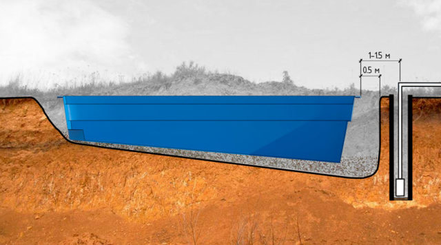 Az elrendezés gödrének paraméterei 15-20 cm-rel nagyobb mélységű edényt jelentenek a homok és a zúzott kő párnájának megszervezéséhez. A gödör szélességét a talaj fagyásának mutatói és a térségben a vetés mértéke határozza meg, tőlük függően 50-150 cm-rel növelhető a medence mindkét oldalához viszonyított teljes méreteihez képest.