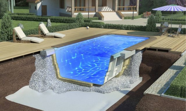- kivitel betonszalag formájában, amelyet a beástatott kompozit medence kerülete mentén hajtanak végre a nyaraló számára.
