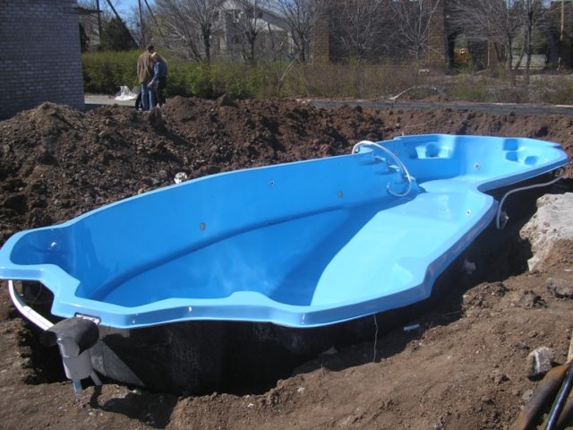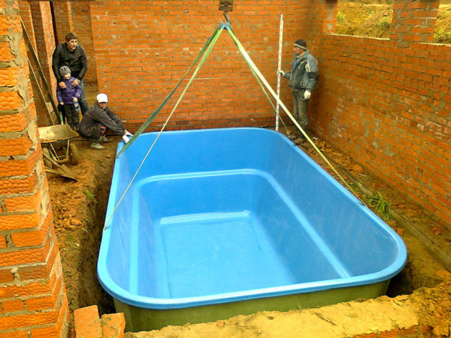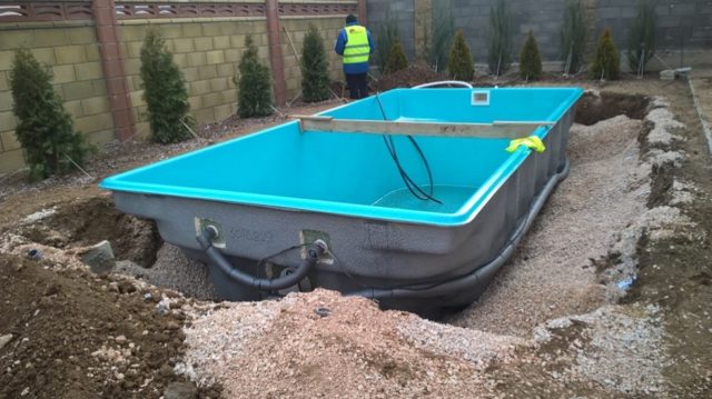 A gödör a nulla jel meghatározása után készül, amely a meglévő területekhez van kötve. A kompozit anyagokból készült medence beépítése magában foglalja a beágyazott részek telepítését, külön helyiségben a vízvezetékek lefektetésével és egy tál felszerelésével. Ezt követően elvégzik a használati helyiség rendezését és az üzembe helyezést.