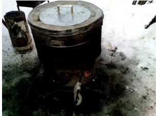 A gép ón teste, amelyre a tartály van rögzítve, állványként szolgál. Az oldalfalban téglalap alakú ablakok darálóval vannak kivágva egymással szemben. Tűzifát raknak rajtuk keresztül, hogy tüzet hozzanak. A munkatér belsejében fűrészport öntenek az aljára, a raklapot és a rácsokat felfüggesztik. Fedje le mindent felülről.