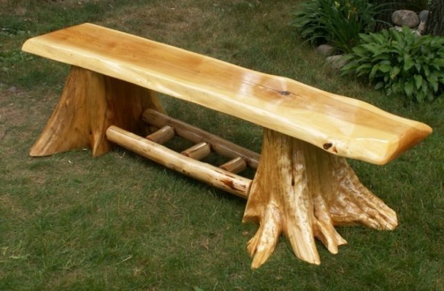 - A klasszikus háttámlás pad a hosszú pihenés kényelmét nyújtja. Az ülést hasonlóan saját kezével készítik a hosszában laza rönkből. A háttámlához egy deszka vagy egy kerek fa fűrészelése után megmaradt második rész alkalmas. A tartóelemeket rönkmaradványokból készítik. Vékony körök vannak hozzájuk rögzítve, amelyek a hát hátuljának támaszaként állnak ki.