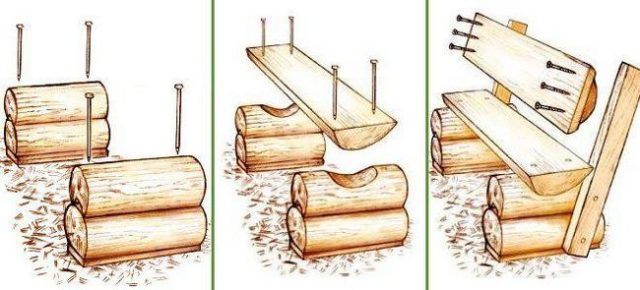 Csak a tartókat készítik rönkből egy gyönyörű pad saját kezűleg. Minden állvány két, egymásra rakott körből áll. A támaszok hosszú vastag rúddal vannak összekötve egymással. Ehhez az áthidaló alatti rönkök testében saját kezűleg vágnak barázdákat egy láncfűrésszel.