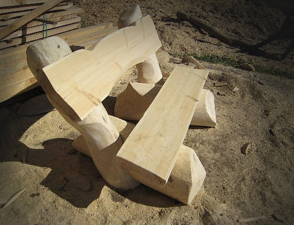 Egy hosszú vastag rönköt hosszában kétfelé engedünk. Ezek az ülés és a háttámla üres részei lesznek. Két másik hosszú, de kisebb átmérőjű kör van a földbe temetve egy lejtő alatt. Ezek lesznek a háttámla oszlopai. Annak érdekében, hogy biztonságosan állhassanak, vízszintesen elhelyezett rövid ütközőket rögzítenek a föld alján lévő támaszokhoz, előtte baltával kivágva a mélyedéseket. A fűrészelt rönk egyik felét a kerek fa tetejére helyezzük. Annak érdekében, hogy az ülés biztonságosan le lehessen feküdni, az alatta lévő ütközőkre egy fejszével is mélyedéseket vágnak ki. Hasonló módon a fűrészelt rönk második fele a hátsó állványokra van rögzítve. A kész padot lenmagolajjal nyitják.
