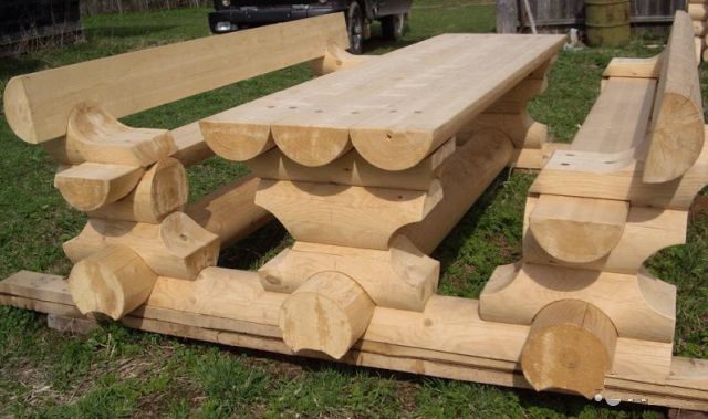 A feladat leegyszerűsítése érdekében egyes elemeket bárral lehet helyettesíteni. Például a padok hátuljára helyezzen függőleges támaszt. Ha mégis egyszerűbb akar lenni, akkor a naplókat csak a teljes kompozíció alapjául használjuk. Az asztallap, az ülések és a padok hátulja össze van szerelve a deszkáról. A bútorok azonban szebbnek tűnnek, ha teljesen kerek fából készülnek.