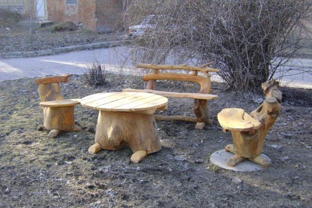 - A kerti bútorkészlet különálló elemekből áll. A kötelező attribútum a táblázat. A hátsó padot a közelében helyezik el. A tuskókból egyetlen széket saját kezével vághat le. Az asztal alapja egy vastag fatörzs vagy egy széles csonk darabja. Az asztallapot kalapálják ki a deszkákból.