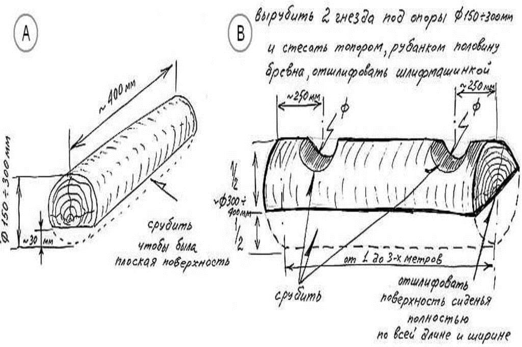 Ha az építkezés után az udvar hosszában fűrészelt rönk van, a pad előállítása 20-30 percet vesz igénybe. Láncfűrésszel ellátott tartóknál két kört fűrészeljen le, amelyek hossza megegyezik a félnapló szélességével. A depressziókat baltával választják ki az üres helyeken. A kerek faanyagokat a barázdákkal felfelé fektetik a földre, és az ülést felszerelik. Szögekkel vagy önmetsző csavarokkal történő rögzítés opcionális. A támaszokon lévő hornyokat pontosabban kell beállítani a félnapló félkör alakú oldalához, és biztonságosan rögzülnek a súlya alatt.