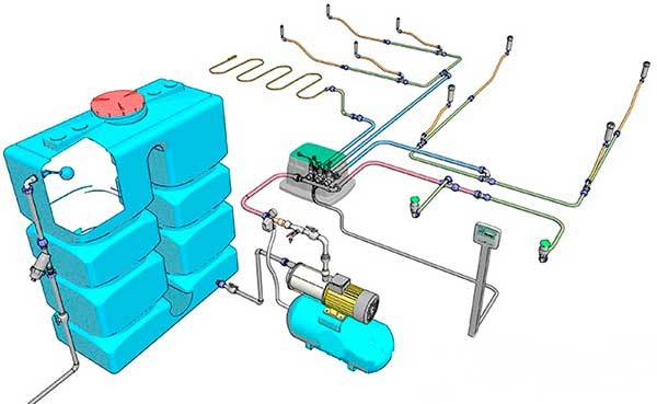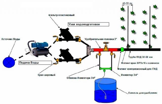 A víztelenítés előállításának megkezdése előtt pontos diagramot kell készíteni a rendszer összes csomópontjáról és a csővezetéknek a helyszínen való áthaladásáról. Több központi ág használata esetén célszerű ilyen elosztást végezni úgy, hogy a víz forrása középen legyen. Ez hozzávetőleg azonos nyomás kialakulását segíti elő a csővezeték minden ágában. Az automatikus öntözési sémák egyik lehetősége látható a fotón.