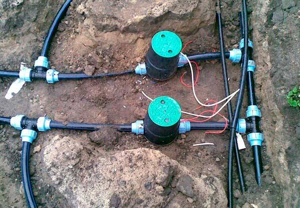 - Az öntözőrendszer fő ágának műanyag csöve egy adapter segítségével csatlakozik a mágnesszelephez. A cső átmérője az öntözendő területtől függ, de általában 32–40 mm elegendő. A víztelenítés fő ága a növekvő növényekkel a sorokra merőlegesen helyezkedik el. A csővezeték vége dugóval van lezárva.
