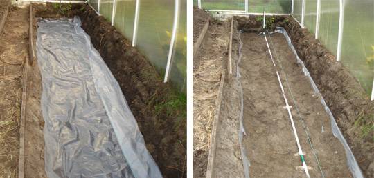Az automatikus öntözővezeték nyílt talajra történő lefektetésének földalatti módszere kényelmes, mert télre nincs szükség a teljes rendszer szétszerelésére, ráadásul a föld alatt fekvő cső nem fogja zavarni a kerti ágyban való gyomlálást. Az árok mélysége elegendő 400–600 mm. A műanyag cső visszatöltésekor először szórjon meg egy kicsit homokkal vagy puha talajjal, hogy a kövek ne hulljanak.