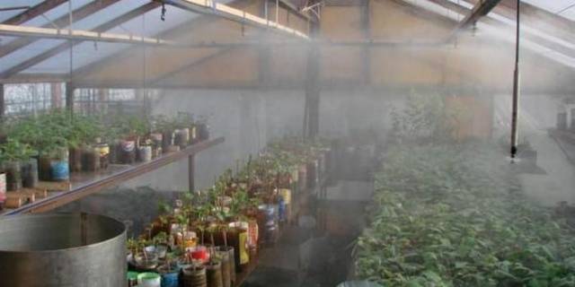 A levegő öntözőrendszere lehetővé teszi az esőhatás kialakítását az üvegház belsejében. Ugyanúgy készül, mint a talaj feletti vagy csepegtető rendszer, csak az összes cső van a felszínen.A fő öntözővezetéket az üvegház mennyezete alatt vezetik le. A vékony PVC csövek kis leereszkedései készülnek belőle, a végén permetezőgépekkel. Az ereszkedés hossza a mennyezet magasságától és a karbantartás egyszerűségétől függ a tulajdonos döntése alapján.