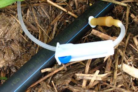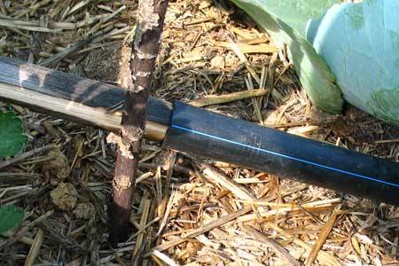 - A csepegtető vezetékek csatlakozása a központi csőhöz pólusszerelvényekkel történik. A perforált cső másik vége dugóval van lezárva. Egyszerű dugaszolási lehetőség egy kis fa csap, lekerekített és illeszkedik a cső átmérőjéhez.