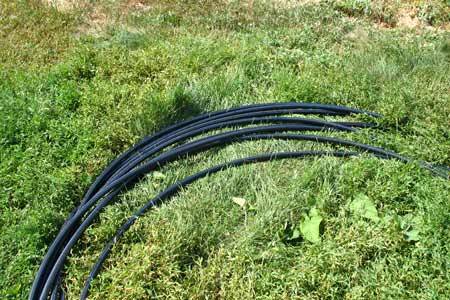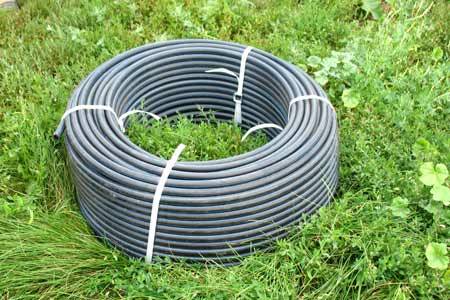 - A hordók felszerelése után folytassa a csővezeték telepítését. A központi ágakhoz vegye a műanyag csövet vastagabbra, mint az ágakra. Általában a 32-50 mm átmérő elegendő lesz. A HDPE csövet tömlőként az öböl értékesíti. A vele való munka megkönnyítése érdekében a csövet kitekerik a helyszínre, és időt adnak a fekvésre. A napon megpuhult műanyag hajlékonyabbá válik. A kiegyenlített csövet a rajz szerint a kívánt méretű darabokra vágják, és az ágyak mentén, de növekvő növényekkel a sorokon át fektetik. A perforált szalagok összekötéséhez minden sorban a szerelvényeket elvágják.