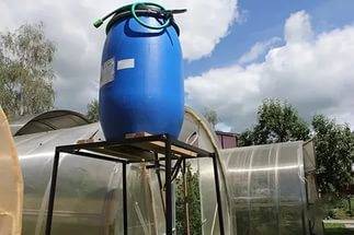 - A csepegtető rendszer gyártása a víztartály felszerelésével kezdődik. A tartály a legjobb rozsdamentes acélból vagy műanyagból.A tartály alatt 1–2,5 m magasságú fémszekrényt kell hegeszteni, amely a helyszín megkönnyebbülésétől függ. A szegélykővel ellátott tartályt úgy kell elhelyezni, hogy a csepegtető rendszer minden ága hozzávetőleg azonos távolságra legyen tőle. Ezzel azonos víznyomás érhető el a csővezetékben. Ráadásul figyelembe kell venni a csővezeték tartályának kényelmes ellátását a víz pumpálásához. Ha üvegházban végeznek csepegtető öntözést, akkor a hordó kívül és belül egyaránt felszerelhető. A második módszert gyakrabban használják fűtött üvegházaknál, ahol zöldségeket termesztenek télen.Figyelem! Amikor PVC tartályt használunk csepegtető rendszerhez, figyelembe kell venni, hogy falainak átlátszatlanoknak, lehetőleg fekete színűeknek kell lenniük. Ha a műanyag átengedi a napfényt, a tartályban lévő víz gyorsan virágzik, és ezek az algák eltömítik a szűrőt és a csepegtetőket az öntözés során.