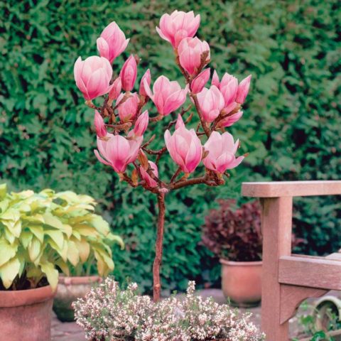 Az otthoni magnólia alacsonyan növő cserje, amelyet tágas és mély virágcserepben kell termeszteni. Ez előfeltétele a fejlett gyökérrendszerű növény rúd formájában történő termesztésének.