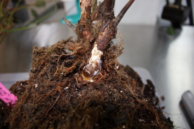Jellemző jelek: a levelek megsárgulnak és elpusztulnak, a gyümölcsök kicsiek, a törzsnél lévő kéreg megsérül, fokozatosan hámlik, felszíne mentén íny szivárog. A gyökerek eltávolításakor színváltozás figyelhető meg, hámozott felület jelenléte, vizesség.