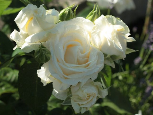 Wedding Piano jól néz ki, kombinálva más növényekkel. A tájtervezők azt javasolják, hogy ezeket a rózsákat fehér és kék virágok mellett termesszék.