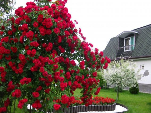 Külön érdemes megemlíteni a szőlőt és másokat. göndör növények, amelyek a virágzó évelők magas képviselőihez tartoznak. Igénytelenek, sokan szépen virágoznak egész nyáron és ősszel egészen a nagyon hidegig. A képen egy mászó rózsa. Nagyon hosszú és erőteljesen kellemes a szemnek, díszítve a biztosítottat támogatás... A különféle árnyalatokban bemutatott irreális lépcsőzetes luxus fokozottabb gondosságot igényel, de a megjelenés igen rózsák megéri.