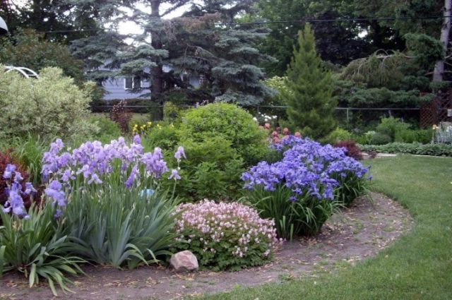 - Rétegződés - az íriszek közepes méretűek, ezért kombinálhatók mind magasabb, mind rövidebb növényekkel.