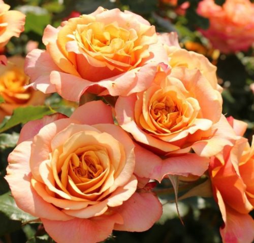A kezdő időszak májusban zajlik. A jövőben a növényt nagy kettős virágok borítják. Színe rézsárga, hátulján krémes rózsaszín és barack árnyalatok találhatók. A virágok alakja kupacsos, átmérője eléri a 10 cm-t, mindegyik 70-80 sziromból áll.