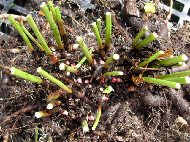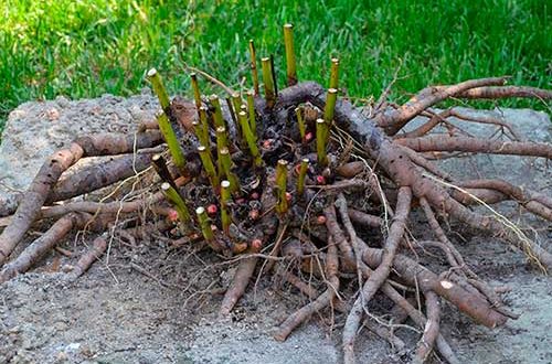 Nincs semmi nehéz a rizóma felosztásában. A bazsarózsa bokrot teljesen ki kell ásni a földből, és késsel vagy lapáttal egy nagy gyökeret több kisebbre vágni. Általában a rizómát két vagy három részre osztják. Mindegyiket új helyre ültetik át.