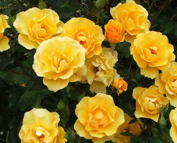 Ezek alacsony, dús, sokvirágú rózsák, amelyek nem hagyják abba a virágzást a nyári szezonban. A bokor átlagos magassága 80-110 cm, a virágok kettősek és félig kettősek. Az ecset virágzatain több darabban helyezkednek el. Az átmérő nem haladja meg a 6-8 cm-t.