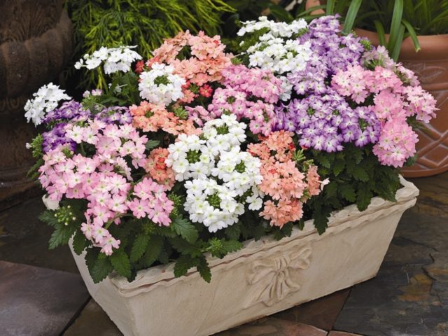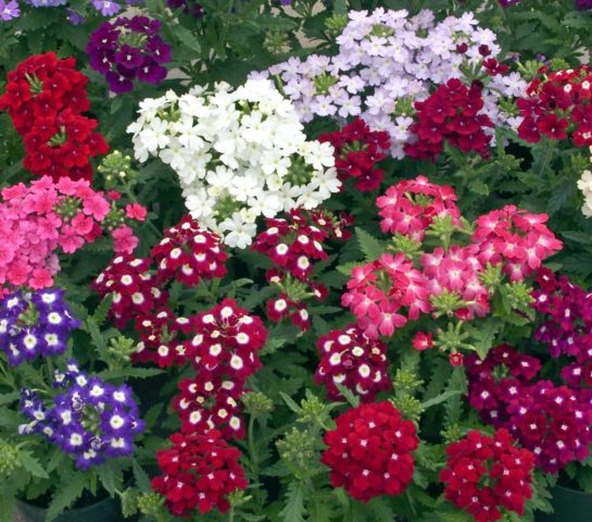 A hibrid verbena virágok a színek és színek zavargásával örvendeznek: a monofonistól (kék, lila, rózsaszín, narancs, fehér) a tarkaig.