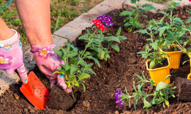 A konténerekben öntözött Verbena-csírákat egy földdarabbal együtt előkészített lyukakba mozgatják, földdel megszórják, kissé megtapogatják, adagolva öntözik, tőzeggel mulcsozzák.