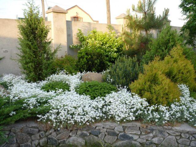 A kertészek és a tájtervezők gyakran kombinálják a nyári havat sötét levelű növényekkel, például harangokkal és echiummal. A yaskolka fotóján ezüstös hófehér szőnyeg található, amely különösen észrevehető a fiatal lédús zöldek hátterében.