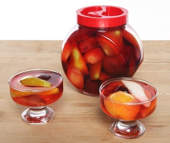 A recept 200 g gyümölcsöt tartalmaz. Felekre kell őket vágni, a magokat és a maghéjakat el kell távolítani. Helyezze a gyümölcs keveréket egy lufiba, öntsön 200 g cukrot. A kétszer öntés elegendő lesz egy gyönyörű színű édes-savanyú ital megszerzéséhez.