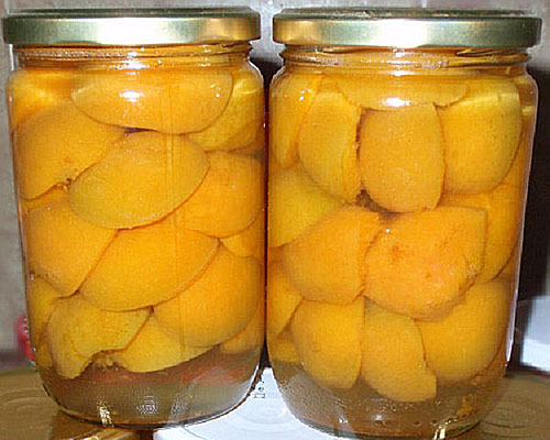 Vágja le a gyümölcsöt, távolítsa el a magokat. Forraljuk fel a szirupot a többi összetevőből, öntsük a gyümölcsöt kétszer. Zárjon be egy nagybetűvel.