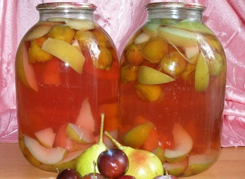 A körtét le kell vágni, a maghüvelyeket meg kell tisztítani. Távolítsa el a magokat a szilva közül. A gyümölcsöket egyenlően ossza üvegekbe. Forraljon fel édes cukor- és vízoldatot, öntse bele a gyümölcs alapanyagokat, fedje le fedéllel és sterilizálja. 25 perc múlva hermetikusan lezárja az italt.