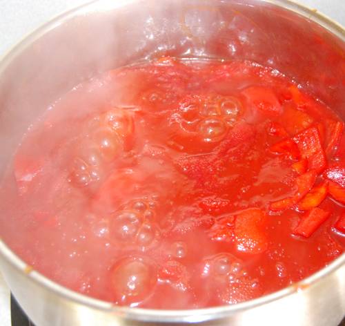 A paprikaszeleteket forrásban lévő mártásba mártjuk, a keveréket felforraljuk és 25 percig pároljuk.
