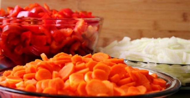 Minden zöldséget alaposan meg kell mosni, majd felaprítani. Az ebben a receptben szereplő paprikát durvára vágjuk, a sárgarépát durva reszelőn, a hagymát félkarikára vágjuk.