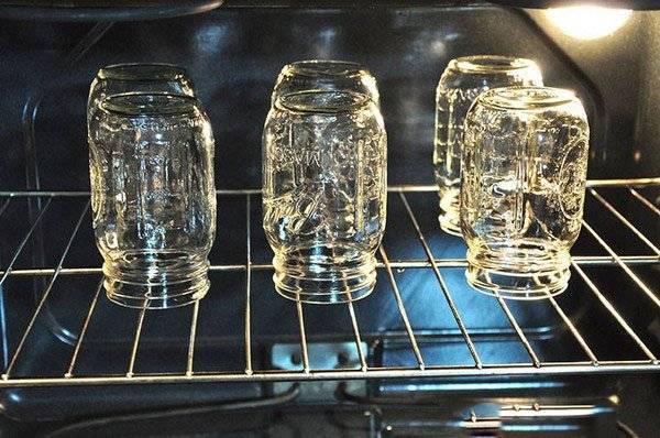 Ezután a tartályokat megfordítjuk, és hagyjuk megszáradni. Most megkezdheti magát a sterilizálást. Az összes edényt fejjel lefelé helyezzük a sütőbe. Ha a kannák még nem teljesen szárazak, akkor fejjel lefelé helyezik őket. A kemencében történő sterilizáláshoz állítsa be a hőmérsékletet 150 fokon belül. A félliteres üvegeket legalább 15 percig a sütőben tartják, de a háromliteres edényeket körülbelül 30 percig kell melegíteni.