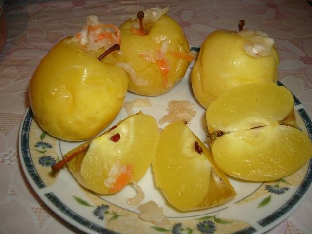 - Az almákat a tetején egy rétegben helyezzük el, az Antonovka gyümölcsök közötti réseket káposzta borítja.