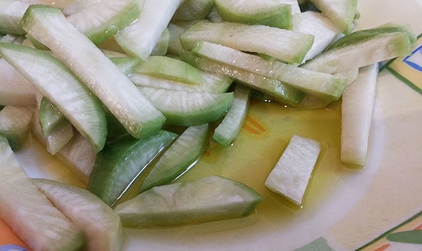 - A gyökérnövényeket megmossuk, megpucoljuk, vékony csíkokra vágjuk.