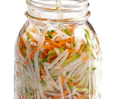 Sárgarépa hozzáadása az edényhez pácolás közben lágyítja a készítmény ízét és vonzóbbá teszi annak színét. A főzési technológia teljesen hasonló az előző receptben leírtakhoz. 1 kg retekhez adjunk hozzá 300-400 g sárgarépát.