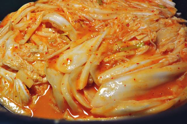 Miután a káposztát sóban és cukorban savanyítottuk, meg kell mosni és kissé megszárítani, majd visszatenni egy nagy tartályba, és forró pasztával összekeverni. Áztassa még 4 órán keresztül a pácolással, majd keverje meg a káposztát, és hagyja ismét 4 órán át. Ezt követően a kimchi üvegedényekbe helyezhető és szorosan lezárható. Fűszeres snack tálalása az asztalon növényi olaj hozzáadásával ajánlott.