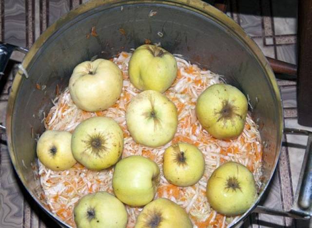 Nem írjuk le az alma káposztába áztatásának folyamatát, mivel az megegyezik a már leírt recepttel. Csak vegye figyelembe, hogy egy káposztalevél kerül a serpenyőbe a munkadarab alján és tetején. Egy fa kört vagy egy nagy lemezt tettünk a munkadarabra, rájuk hajlítva.