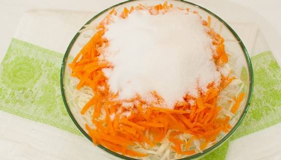 - Az asztalon vagy egy széles medencében keverje össze a káposztát és a sárgarépát granulált cukorral és sóval, alaposan őrölje meg, amíg a lé felszabadul.