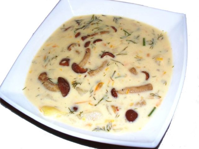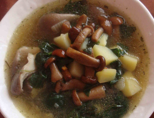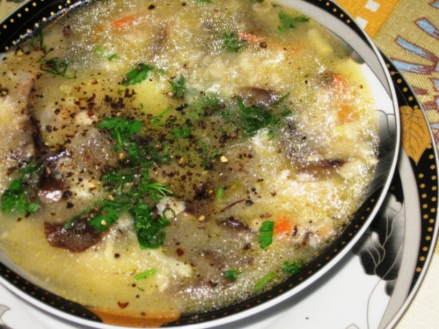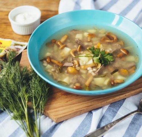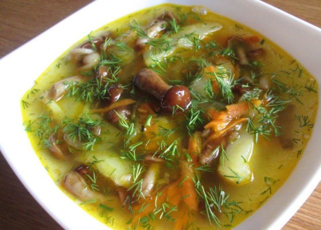 Egy kiadós étel elkészítéséhez friss mézes gombából levest főzhet gabonafélék hozzáadásával. Ez a recept sok zöldséget tartalmaz vízen, de szükség esetén bármilyen húsleves használható.